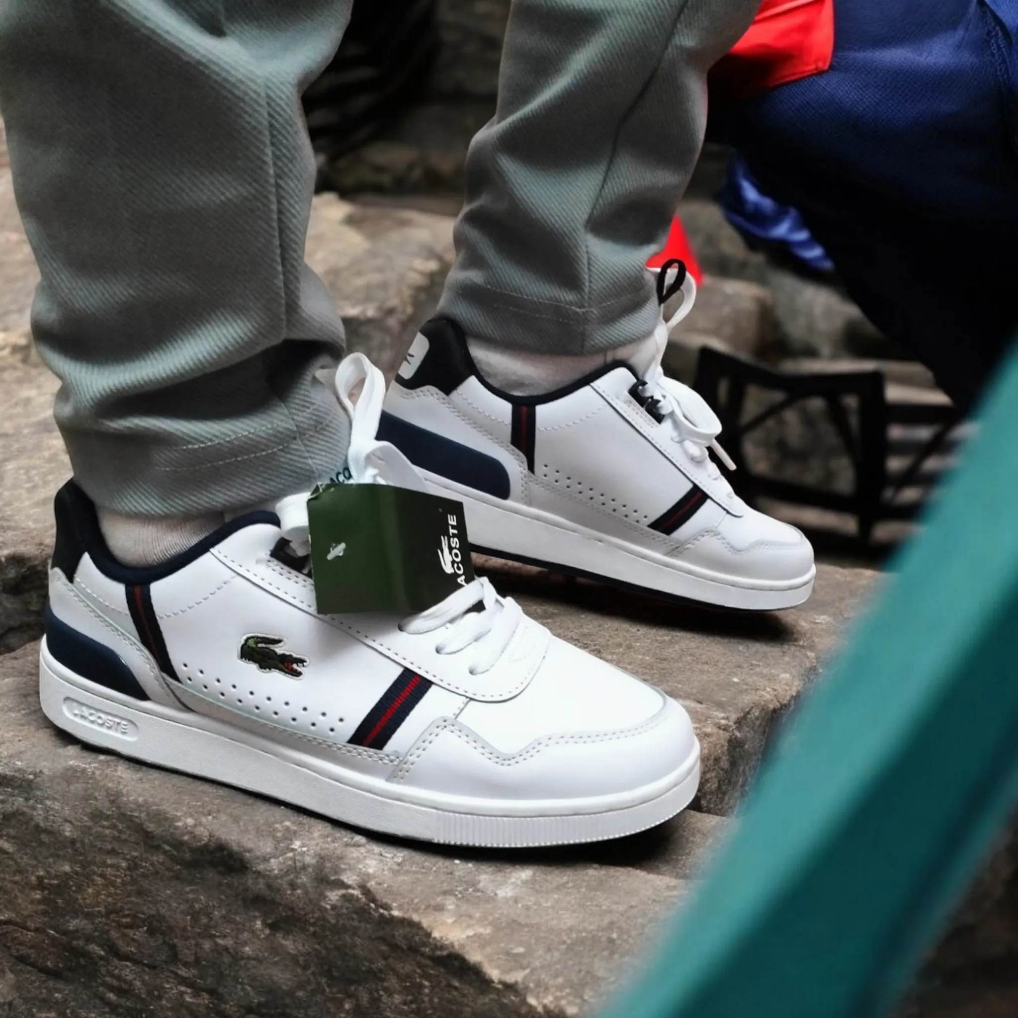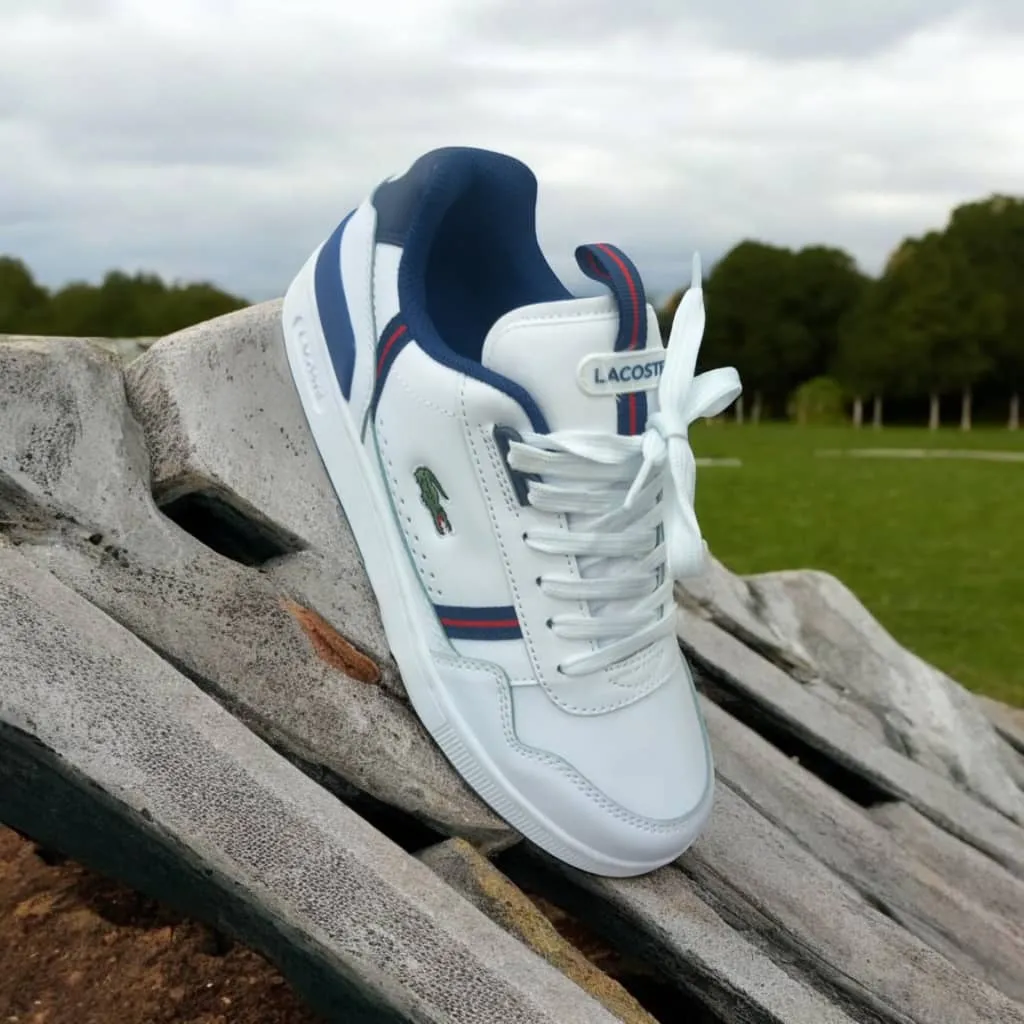 Chaussure de sport *Lacoste* au design élégant et aux couleurs modernes, combinant le blanc et le bleu. Fabriquée avec des matériaux de haute qualité pour offrir confort et style à chaque pas. Parfaite pour un look casual et quotidien.