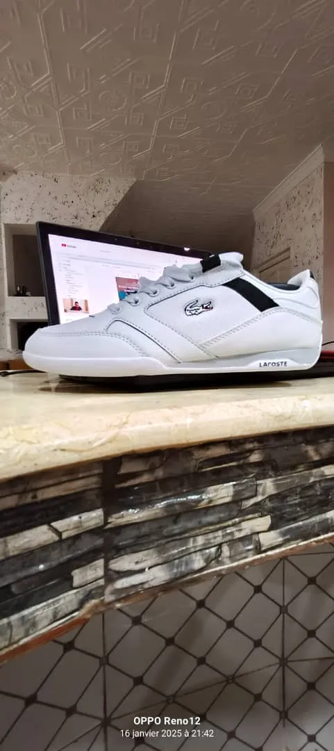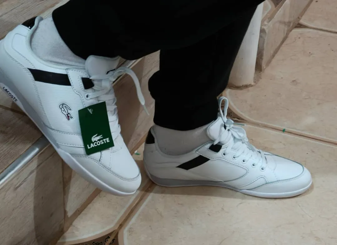 حذاء رياضي من علامة "Lacoste". يتميز بلونه الأبيض مع تفاصيل سوداء على الجوانب، وشعار التمساح الخاص بالعلامة يظهر بوضوح. يبدو أن الحذاء مصنوع من خامة جلدية أو شبه جلدية، مما يجعله مناسبًا للاستخدام اليومي أو الأنشطة غير الرسمية. التصميم أنيق ويعكس جودة العلامة التجارية.