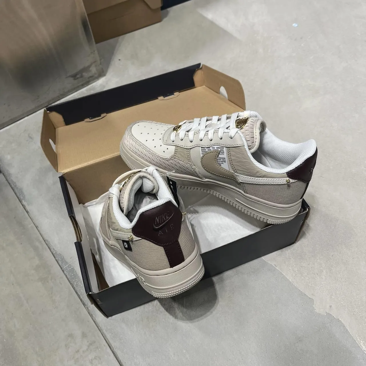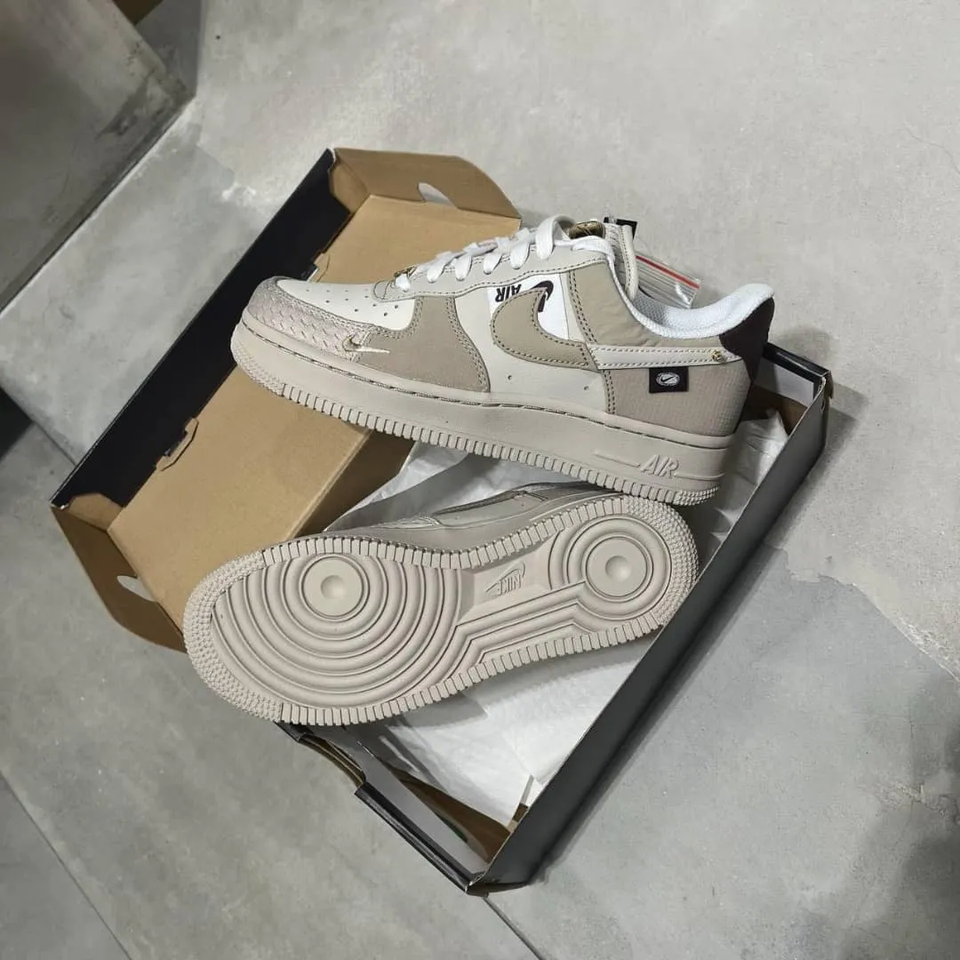 Sneakers Nike Air Force 1 au design classique et élégant. Confortables et stylées, elles sont parfaites pour un look urbain. Détails gris et touche orange pour un style unique. ✅👟